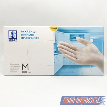 Рукавички вінілові припудрені в боксі розм.М 100шт SIRAP-7263 |